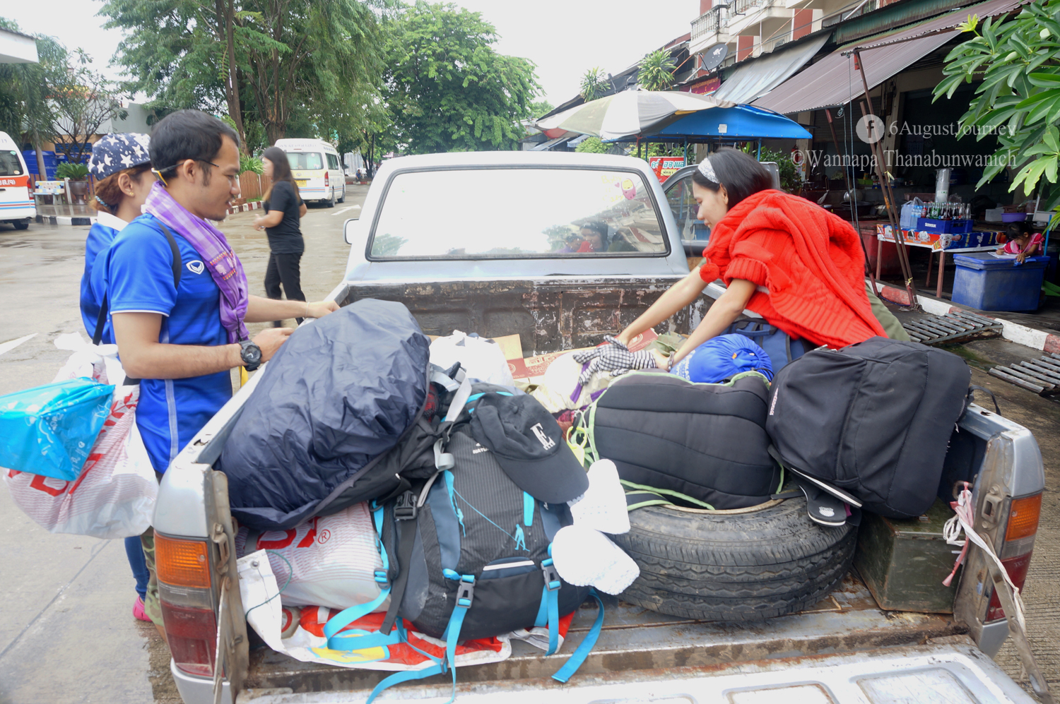 เมื่ออุปกรณ์ดำรงชีพในป่าพร้อมแล้ว เราก็มุ่งหน้าขึ้นไปบนจุดกางเต็นท์ที่อยู่บนเขาอีกทีค่ะ มันเด็ดตรงนี้แหละค่ะ 55+ ถ้าใครมีโอกาสมาแนะนำให้ลองนั่งหลังกระบะค่ะ ได้อารมณ์คนป่าสุดๆ บุกป่า ฝ่าดง ระหว่างทางโดนกิ่งไม้ฟาดหน้าไป 2-3 ทีค่ะ หน้านี้เป็นแนวเหมือนโดนแมวข่วนเลยค่ะ ไม่ใช่ว่ามองไม่เห็นน่ะ แต่คือหลบกิ่งแรกก็เจอกิ่งสอง ตลกตัวเองค่ะ ไปชมหนทางกันว่าที่นี่หน้าฝนมันมากกกก