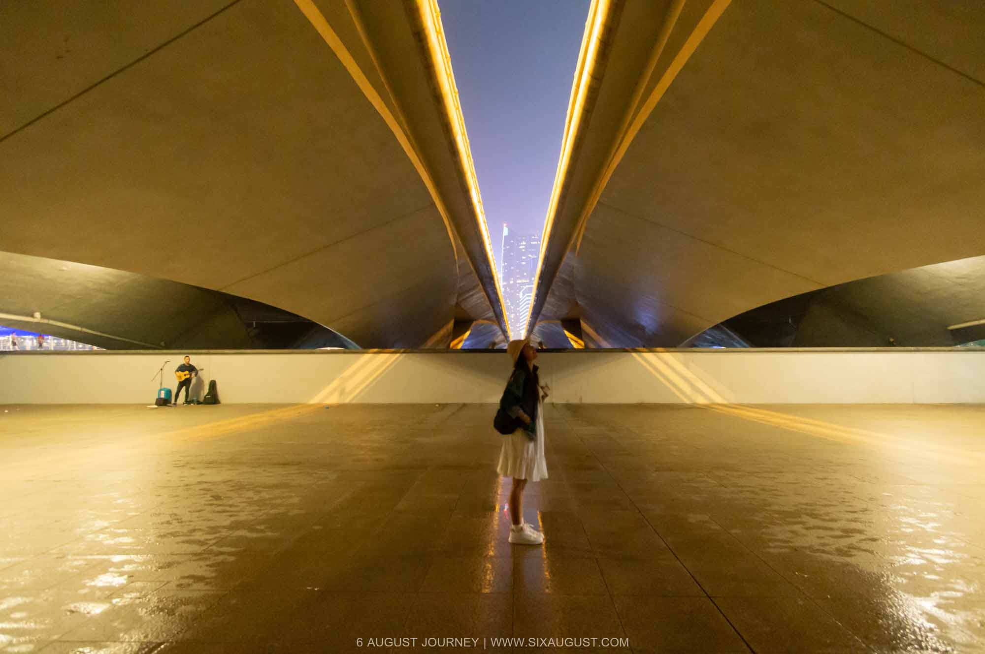 เราไม่ได้ชม Spectra- A Light & water show จากลานของ Marina Bay Sands แต่เรามาชมฝั่ง Esplanade เพราะที่ Esplanade มีสะพาน Esplanade Highway ที่ใต้สะพานก็ถ่ายรูปสวยแบบนี้เลย